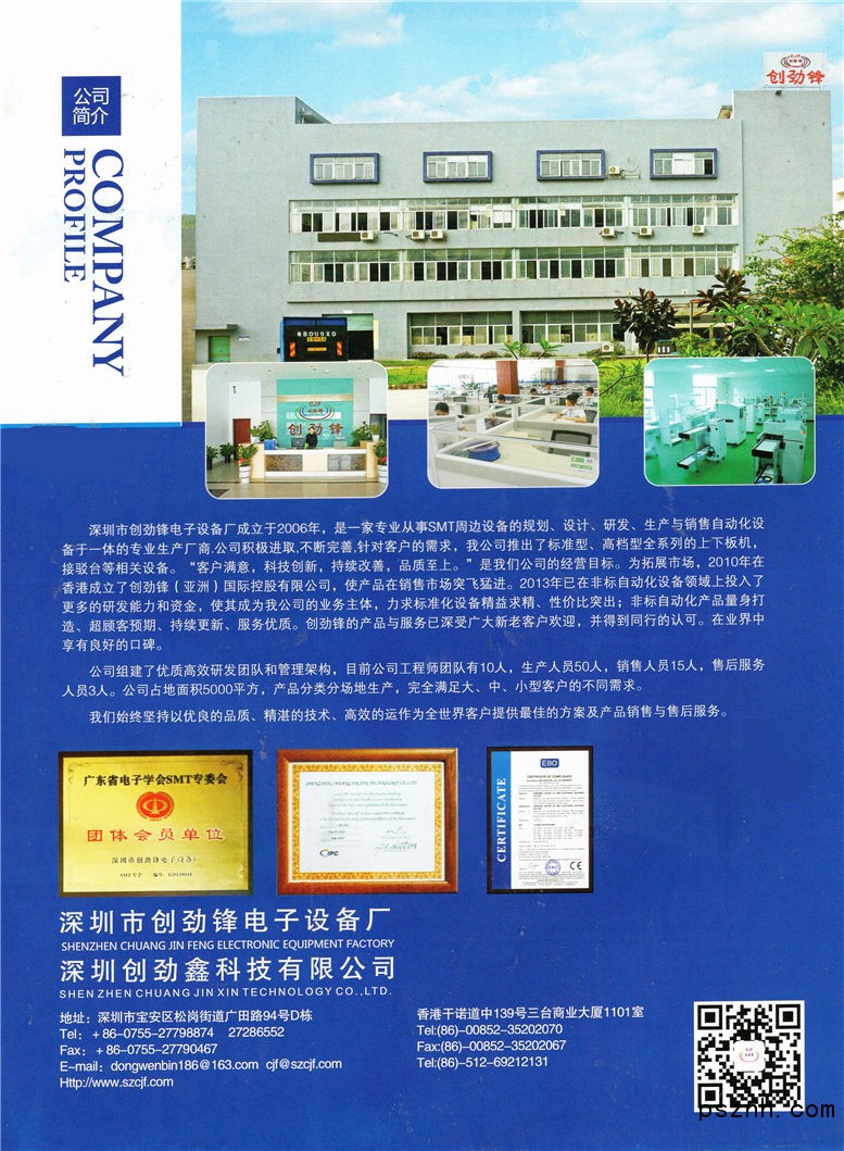 深圳市創(chuàng)勁鋒電子設(shè)備廠是一家專業(yè)從事SMT周邊設(shè)備的規(guī)劃、設(shè)計(jì)、研發(fā)、生產(chǎn)與銷售自動化設(shè)備于一體的專業(yè)生產(chǎn)廠商。公司積極進(jìn)取,不斷完善,憑著我們多年的經(jīng)驗(yàn),持久穩(wěn)固的理念,以客為本,給予客戶最佳的方案與服務(wù),贏得了同行業(yè)中很重要的位置。
