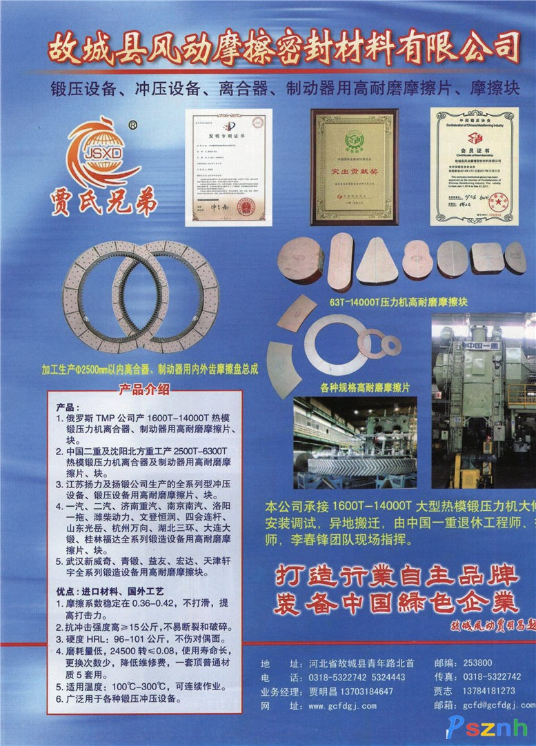 故城縣風(fēng)動(dòng)摩擦密封材料有限公司始建于一九八四年,位于河北省東南部,南與山東北運(yùn)河隔河相望,東與山東德州市接壤。廠址故城縣城北工業(yè)區(qū),緊靠邢德公路,占地面積3000余平方米,職工80余人,技術(shù)人員15人,固定資產(chǎn)180余萬元,專用設(shè)備10臺(tái)套。是專業(yè)生產(chǎn)鍛壓設(shè)備、沖壓設(shè)備摩擦塊、摩擦片的配套廠家。部分產(chǎn)品并出口國外,特別是高耐磨、低磨耗、無石棉、環(huán)保型摩擦塊受到國內(nèi)外用戶的認(rèn)可。