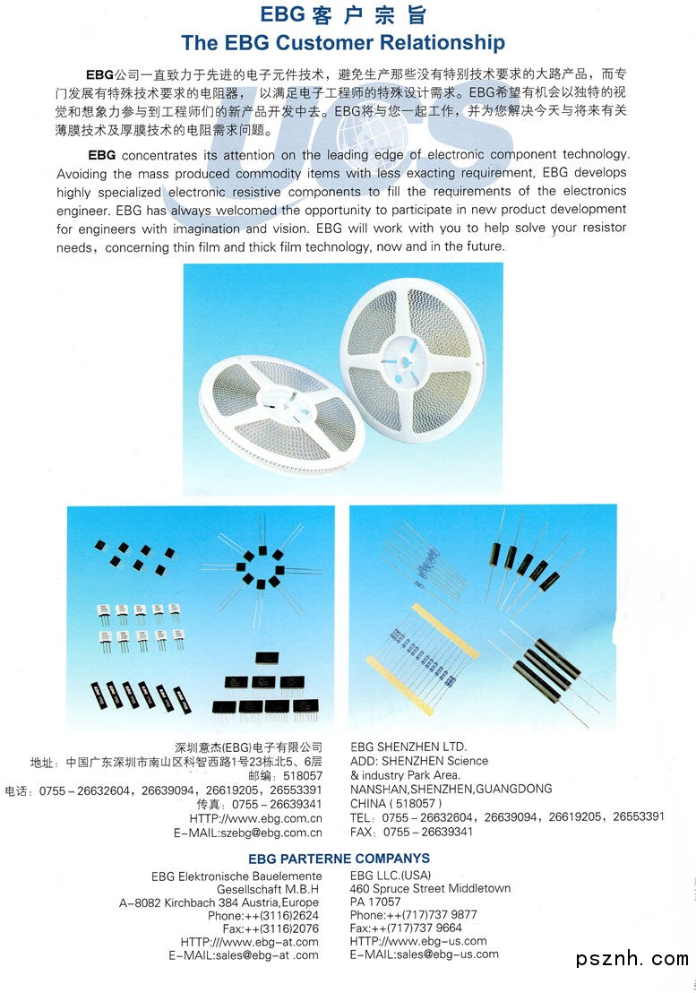 深圳意杰(EBG)電子有限公司是一家中外合資企業(yè).公司成立于1988年,注冊(cè)資金300萬(wàn)美元,由深圳科技園總公司和奧地利EBG m.b.h.公司合資開(kāi)辦.經(jīng)過(guò)多年的發(fā)展,深圳意杰(EBG)電子有限公司已經(jīng)成長(zhǎng)為一家成功的電子元件制造廠商,致力于生產(chǎn)特殊領(lǐng)域要求的電阻器產(chǎn)品,客戶遍及中國(guó)、美國(guó)及歐洲等多個(gè)國(guó)家.