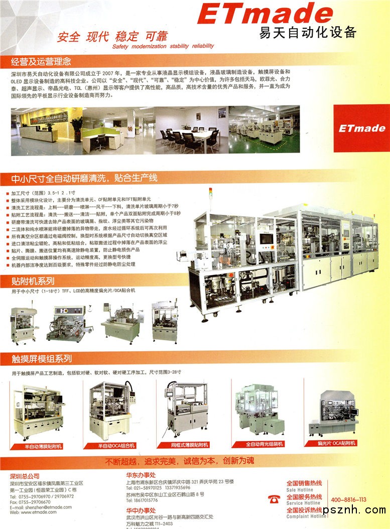 近幾年來(lái),易天自動(dòng)化堅(jiān)持走科技創(chuàng)新興企之路,不斷深化企業(yè)內(nèi)部改革,建立現(xiàn)代化企業(yè)制度,并調(diào)動(dòng)一切積極因素加快技術(shù)創(chuàng)新步伐,先后完成了全自動(dòng)研磨帶玻璃清洗機(jī),全自動(dòng)中、小尺寸偏光片貼附機(jī),自動(dòng)背光組合機(jī),自動(dòng)OCA組合機(jī)等平板顯示行業(yè)專用設(shè)備的研發(fā)與生產(chǎn)。目前,易天自動(dòng)化已擁有清洗,貼合,LCD/TP模組組裝,背光組裝等含蓋從1.5到40寸液晶屏,觸摸屏制造所需的設(shè)備工藝,可生產(chǎn)根據(jù)客戶不同所需而對(duì)應(yīng)的近五十款不同設(shè)備產(chǎn)品。
