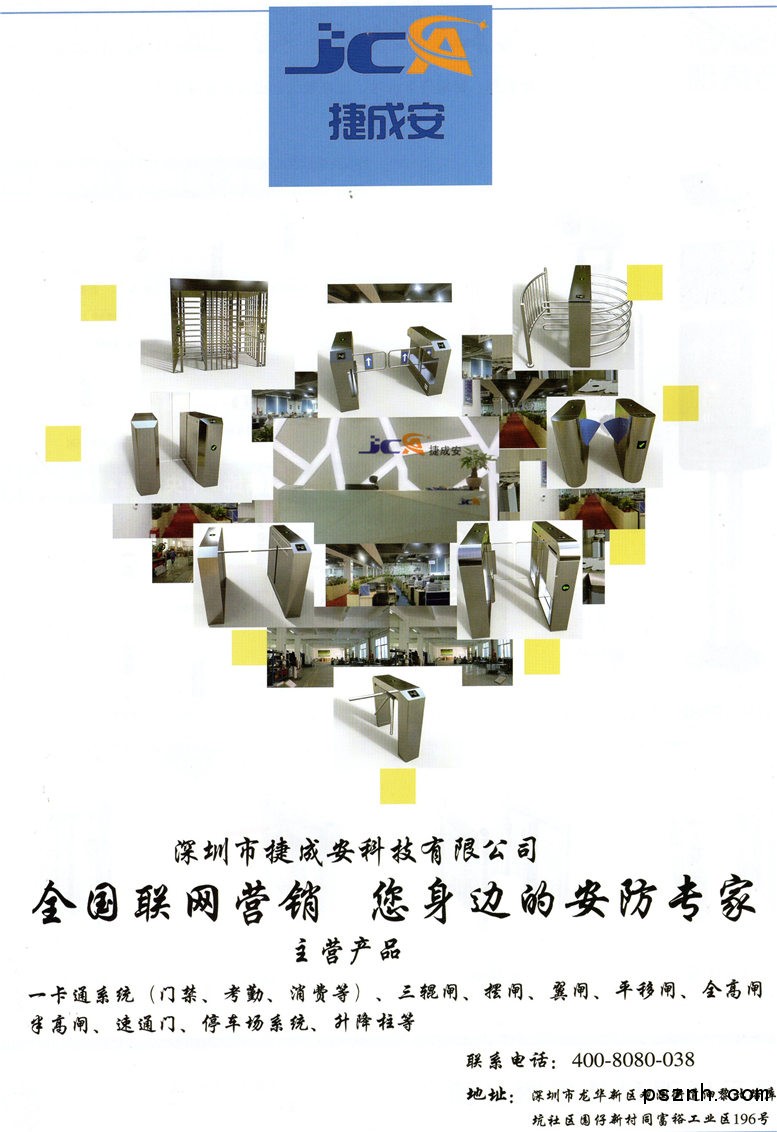 深圳市捷成安科技有限公司是門禁、三輥閘、擺閘、翼閘、平移閘、高轉(zhuǎn)閘、半高閘、速通門、停車場系統(tǒng),票箱、升降柱等設(shè)備生產(chǎn)廠家。具備完善的系統(tǒng)解決方案,系統(tǒng)涵蓋了智能停車場管理系統(tǒng)、智能門禁管理系統(tǒng)、智能通道閘系統(tǒng)及收費管理系統(tǒng)、考勤管理系統(tǒng)、票務(wù)管理系統(tǒng)、工地軟件管理系統(tǒng)等,憑借優(yōu)越穩(wěn)定的系統(tǒng)性能及優(yōu)質(zhì)的服務(wù),捷成安產(chǎn)品備受各企事業(yè)單位、基礎(chǔ)設(shè)施場館、政府機(jī)構(gòu)、交通運輸、住宅小區(qū)、商業(yè)物業(yè)等客戶的青睞。