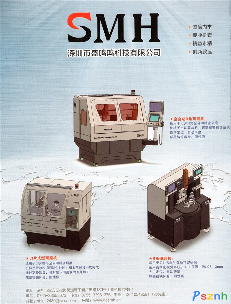 深圳市盛鳴鴻科技有限公司是集設(shè)計、生產(chǎn)、銷售、服務(wù)為一體的自動化設(shè)備制造企業(yè),自2008年跨入數(shù)控刀具行業(yè),一直專注于刀具行業(yè)自動化設(shè)備的研發(fā)和制造。公司以磨床為中心,結(jié)合客戶需求,提供各種機(jī)床、自動化設(shè)備及先進(jìn)工裝夾具。主要產(chǎn)品:數(shù)控刀片溝槽研磨機(jī)、R角研磨機(jī)、刀片倒棱機(jī)、砂輪修整機(jī)、刀片周邊磨床、及銑刀鉆頭精密檢測設(shè)備等。適用于硬質(zhì)合金、金屬陶瓷、PCBN(立方氮化硼)、PCD( 聚晶鉆石)行業(yè)的精密數(shù)控刀具。