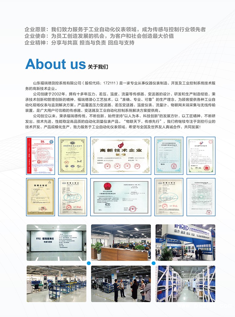 公司創(chuàng)立以來(lái),秉承福瑞德傳統(tǒng),不斷創(chuàng)新,始終堅(jiān)持"以人為本、科技創(chuàng)新"的發(fā)展方針,以工匠精神,不斷研發(fā)出,技術(shù)先進(jìn)、性能穩(wěn)定高品質(zhì)的自動(dòng)化測(cè)量?jī)x表產(chǎn)品?!拔锫?lián)天下,傳感先行”,我們將繼續(xù)專(zhuān)注于測(cè)控行業(yè)的技術(shù)開(kāi)發(fā)、產(chǎn)品規(guī)?;a(chǎn),致力服務(wù)于工業(yè)自動(dòng)化儀表領(lǐng)域,希望與全國(guó)及世界友人真誠(chéng)合作,共同發(fā)展!