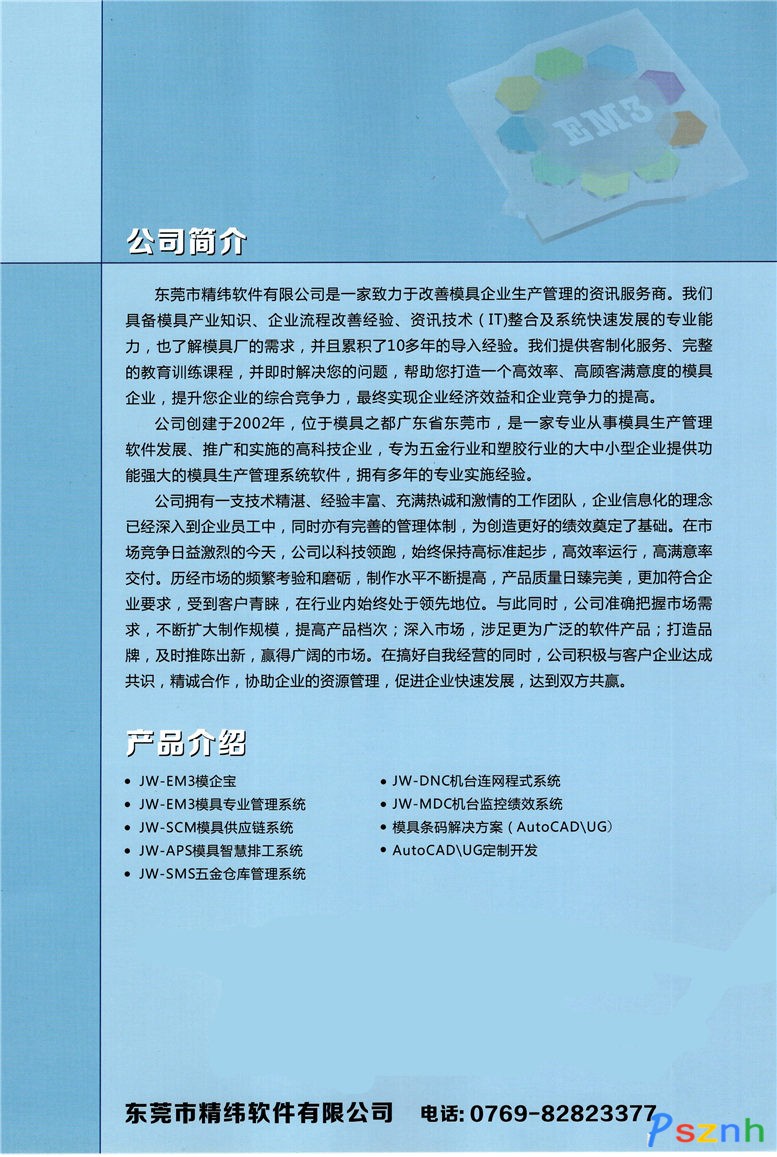 公司創(chuàng)建于2002年,位于模具之都廣東省東莞市,是一家專業(yè)從事模具生產(chǎn)管理軟件發(fā)展、推廣和實(shí)施的高科技企業(yè),專為五金行業(yè)和塑膠行業(yè)的大中小型企業(yè)提供功能強(qiáng)大的模具生產(chǎn)管理系統(tǒng)軟件,擁有多年的專業(yè)實(shí)施經(jīng)驗(yàn)。