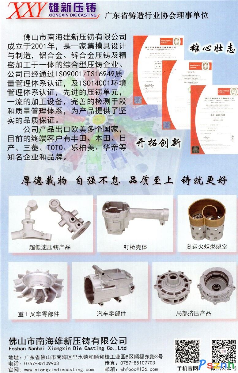 佛山市雄新壓鑄有限公司是位于珠三角地區(qū)的鋁合金、鋅合金(包括:汽車配件、家電配件、風(fēng)動(dòng)工具等)中大型壓鑄企業(yè),2009年擴(kuò)建的工廠座落于佛山市南海區(qū)和桂工業(yè)園B區(qū),設(shè)計(jì)產(chǎn)能為9000噸/年鋁鋅合金壓鑄件。目前年產(chǎn)量達(dá)3000噸以上。公司創(chuàng)立十年來始終堅(jiān)持鑄造工藝技術(shù)的完善和優(yōu)化。廣泛深入地與國(guó)內(nèi)外同行進(jìn)行技術(shù)交流與合作,力求精益求精。 我公司還擁有一流的進(jìn)口全自動(dòng)壓鑄設(shè)備,和精準(zhǔn)的檢測(cè)設(shè)備(光譜儀,三次元等)。且建立了從普通壓鑄到液態(tài)模鍛、抽真空、局部擠壓等完善的壓鑄工藝技術(shù)體系。新技術(shù)新工藝的成功運(yùn)用和完善的模具設(shè)計(jì)方案使一些有特殊要求的鑄件有了品質(zhì)保證。 主要生產(chǎn)設(shè)備:冷室壓鑄機(jī)135T-800T共12臺(tái)(東洋、東芝) 主要檢測(cè)設(shè)備:光譜儀、三座標(biāo)、X光探傷儀等。 己通過ISO/TS16949質(zhì)量管理體系認(rèn)證。 廠區(qū)面積:22000平米。 生產(chǎn)車間面積:9000平米。 主營(yíng):鋁合金、鋅合金壓鑄件。配有模具設(shè)計(jì)制造。