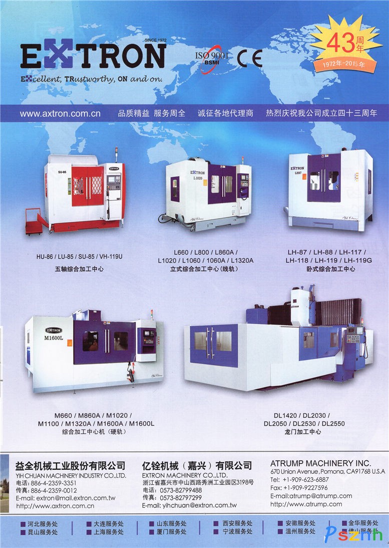 億銓機械(嘉興)有限公司隸屬于臺灣益全機械,益全機械創(chuàng)立于1972年3月,并于1989年在美國洛杉機成立分公司ATRUMP MACHINERY INC.,1995年通過了商品檢驗局ISO9002認證,2003年通過ISO9001質(zhì)量認證,且通過歐洲CE的規(guī)范測試,使產(chǎn)品得以在歐洲銷售,多年來于外銷市場深獲好評并獲獎無數(shù),足跡遍布全球30余國;目前本公司產(chǎn)品有各式立、臥加工中心機與龍門、高速加工中心機,更致力于五軸同動加工中心的開發(fā)。近年來有感于中國大陸市場的未來性及重要性,因此在2000年隨即在大陸浙江省嘉興市設(shè)立分公司億銓機械,以供應(yīng)大陸地區(qū)廣大客戶的需求。