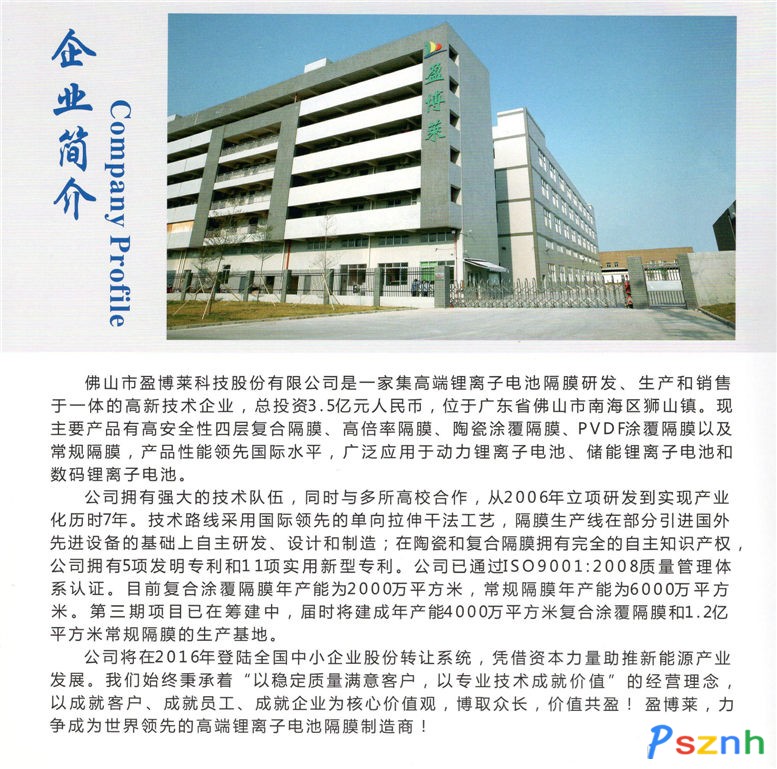 佛山市盈博萊科技股份有限公司是一家集高端鋰離子電池隔膜研發(fā)、生產(chǎn)和銷售于一體的高新技術(shù)企業(yè),股票代碼:839146,總投資3.5億元人民幣,位于廣東省佛山市南海區(qū)獅山鎮(zhèn)?,F(xiàn)主要產(chǎn)品有高安全性四層復(fù)合隔膜、高倍率隔膜、陶瓷涂覆隔膜、PVDF涂覆隔膜以及常規(guī)隔膜,產(chǎn)品性能領(lǐng)先國際水平,廣泛應(yīng)用于動力鋰離子電池、儲能鋰離子電池和數(shù)碼鋰離子電池。