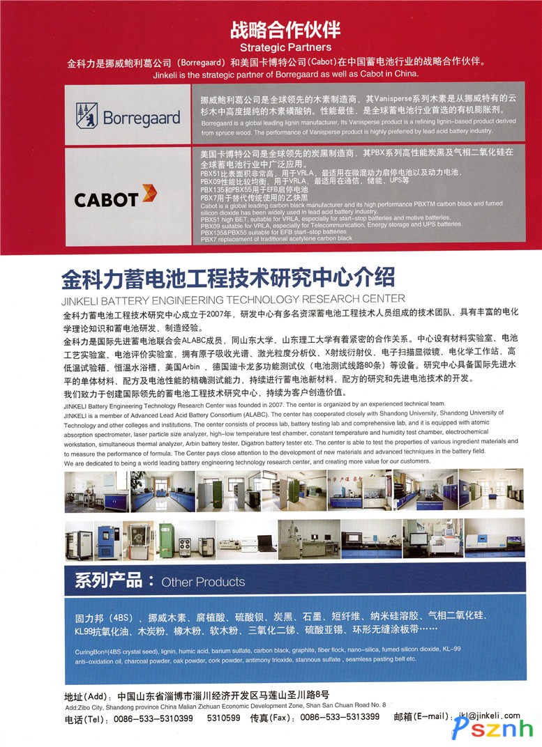 山東金科力電源科技有限公司,成立于1982年,總部位于淄博市淄川經(jīng)濟(jì)開發(fā)區(qū),是中國最大的,集鉛酸蓄電池添加劑產(chǎn)品研發(fā)、生產(chǎn)、營銷和技術(shù)服務(wù)為一體的綜合性企業(yè),是國際先進(jìn)蓄電池聯(lián)合會ALABC成員、中國電器工業(yè)協(xié)會鉛酸蓄電池專業(yè)分會理事單位和中國腐植酸工業(yè)協(xié)會會員。我公司是鉛酸蓄電池添加劑(硫酸鋇、腐植酸、木素磺酸鈉)行業(yè)標(biāo)準(zhǔn)起草單位,其中腐植酸產(chǎn)品是沈陽蓄電池研究所在蓄電池行業(yè)唯一推薦產(chǎn)品。公司現(xiàn)有預(yù)混式復(fù)合添加劑、腐植酸、硫酸鋇、短纖維、固力邦®(4BS)、炭黑、石墨、KL-99抗氧化油、木炭粉、軟木粉、環(huán)形無縫涂板帶等自主生產(chǎn)產(chǎn)品,是挪威鮑利葛木素中國總代理。我公司推出的各類蓄電池用預(yù)混式復(fù)合添加劑產(chǎn)品,在蓄電池行業(yè)得到廣泛應(yīng)用。高品質(zhì)蓄電池添加劑可以在我們金科力得到全面解決方案。