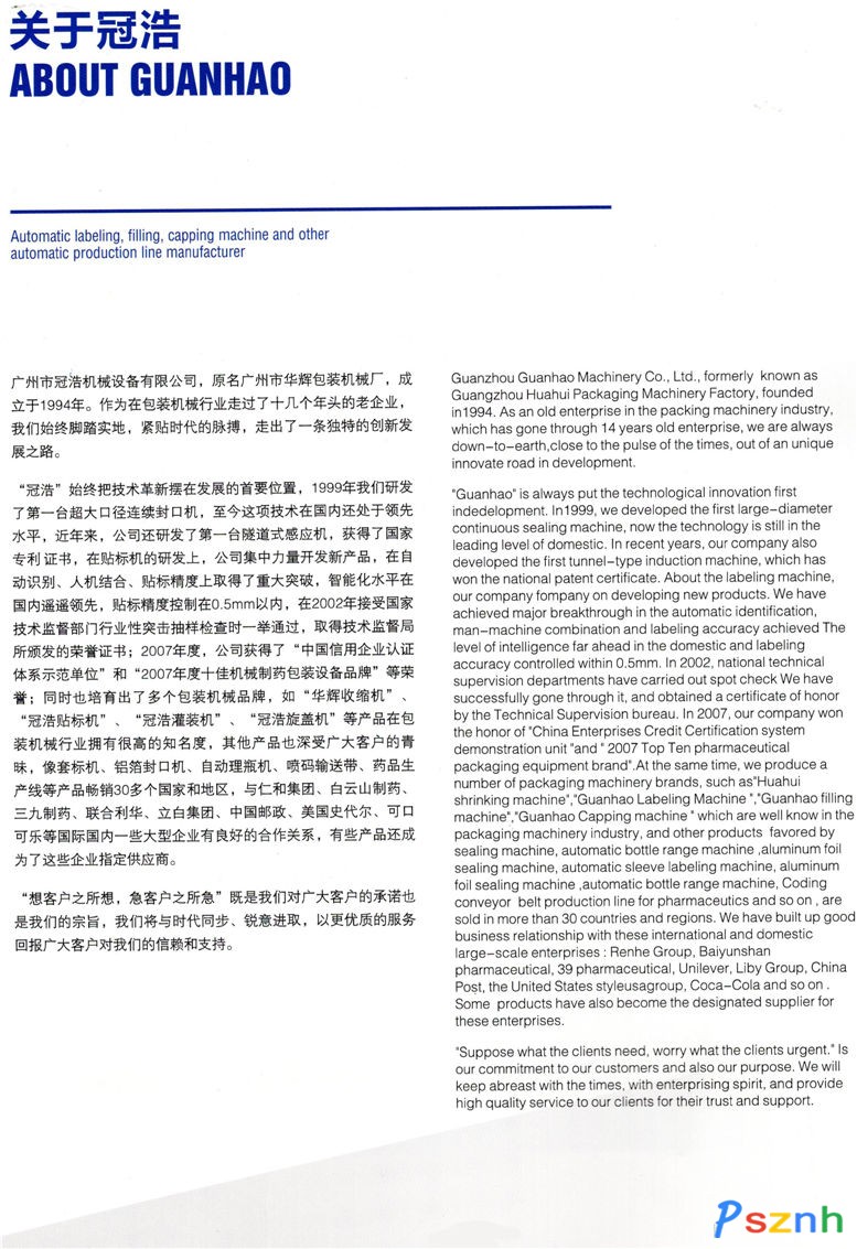 “冠浩“,二十年來對品質(zhì)孜孜不倦的追求,終于獲得了回報,在2014年通過了高新技術(shù)企業(yè)認(rèn)證!成為我們發(fā)展中重要的里程碑!同時也培育出多個包裝機(jī)械品牌,如“冠浩貼標(biāo)機(jī)”,“冠浩灌裝機(jī)”,“冠浩旋蓋機(jī)”等產(chǎn)品在包裝機(jī)械行業(yè)擁有很高的知名度,其他產(chǎn)品也深受廣大客戶的青睞,像套標(biāo)機(jī),鋁箔封口機(jī),自動理瓶機(jī),噴碼輸送帶,藥品生產(chǎn)線等產(chǎn)品暢銷30多個國家和地區(qū),與仁和集團(tuán),白云山制藥,三九制藥,聯(lián)合利華,立白集團(tuán),中國郵政,美國石代爾,可口可樂等國際國內(nèi)一線大型企業(yè)有良好的合作關(guān)系,有一些產(chǎn)品還成為了這些企業(yè)指定的供應(yīng)商。