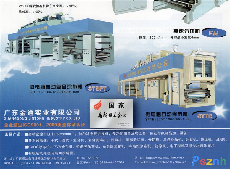 廣東金通實業(yè)有限公司系專業(yè)從事研制、生產(chǎn)印刷包裝機械、涂布機、復合機、分切復卷機、造紙與紙制品加工設(shè)備、有機廢氣處理裝置和環(huán)境保護設(shè)備,也是國內(nèi)最早研制開發(fā)全自動涂布機設(shè)備領(lǐng)域的企業(yè)之一。   企業(yè)自1984年成立至今,被先后認定為“國家重點高新技術(shù)企業(yè)”、“廣東省科技示范單位”、“廣東省連續(xù)十八年守合同重信用企業(yè)”。  2005年經(jīng)國家相關(guān)科技部門特批成立:“汕頭市特種涂布設(shè)備工程技術(shù)研究開發(fā)中心”,中心致力于全球軟包裝涂布設(shè)備領(lǐng)域的專業(yè)性研究,以提升我國軟包裝設(shè)備的全球市場競爭力!