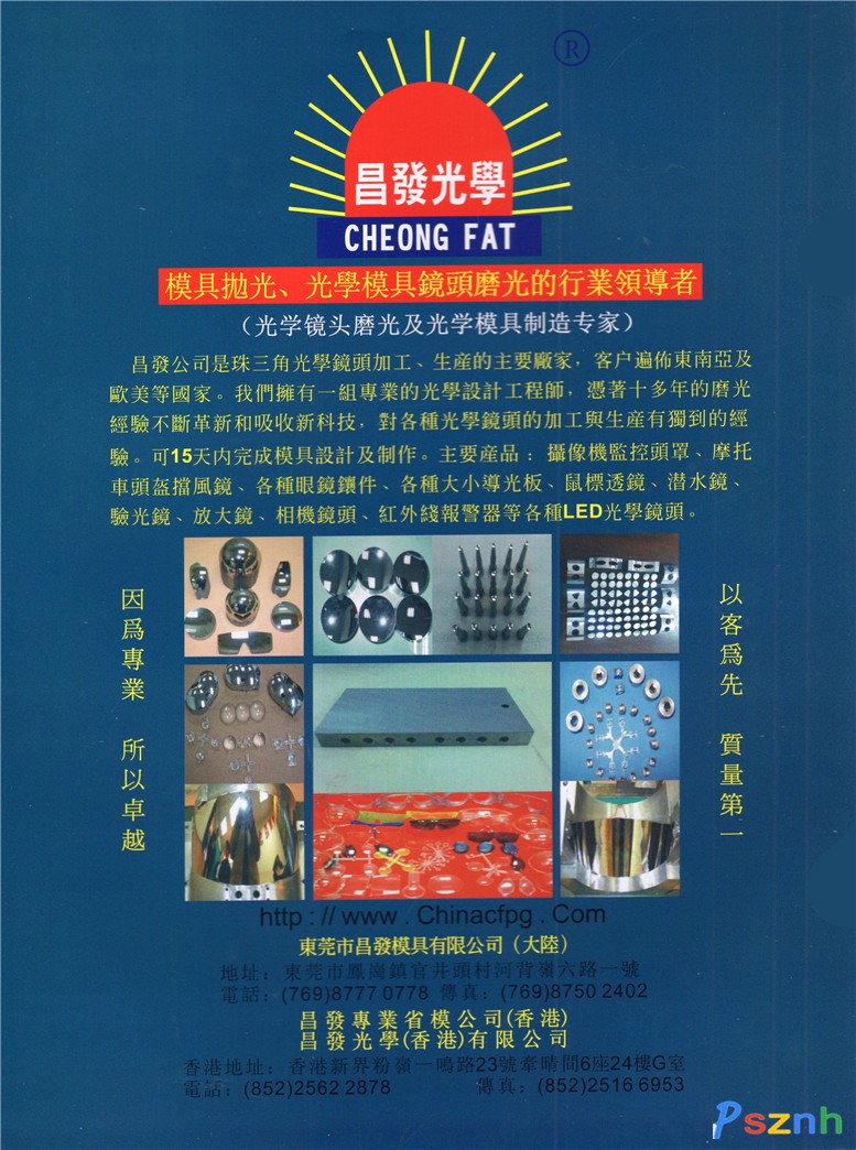 莞市昌發(fā)模具有限公司(大陸) 昌發(fā)專業(yè)省模公司(香港) 昌發(fā)光學(xué)(香港)有限公司        于1995年于香港註冊成立昌發(fā)專業(yè)省模公司,昌發(fā)光學(xué)(香港)有限公司,並在大陸註冊東莞市昌發(fā)模具有限公司,業(yè)務(wù)范圍:一、專業(yè)從事模具表面拋光;二、光學(xué)模具鏡頭磨光;三、光學(xué)模具設(shè)計(jì)與制造。通過二十年的努力、改革和創(chuàng)新,公司業(yè)務(wù)遍及全球,並擁有昌發(fā)省模和昌發(fā)光學(xué)兩個注冊品牌 ,一直是模具拋光行業(yè)的領(lǐng)導(dǎo)者。