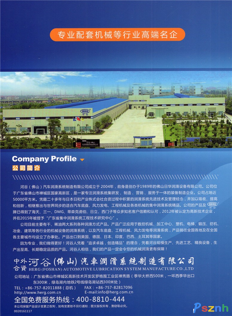 河谷(佛山)汽車潤(rùn)滑系統(tǒng)制造有限公司成立于2004年,前身是創(chuàng)辦于1989年的中日合資佛山日華潤(rùn)滑設(shè)備有限公司。公司位于廣東省佛山市禪城區(qū)國(guó)家高新區(qū)綠島湖羅格圍工業(yè)區(qū),是一家專注潤(rùn)滑系統(tǒng)集研發(fā)、制造、營(yíng)銷、服務(wù)于一體的裝備制造業(yè)企業(yè)。公司占地近50000平方米。憑籍二十多年與日本日和產(chǎn)業(yè)株式會(huì)社合資過(guò)程中積累的潤(rùn)滑系統(tǒng)先進(jìn)技術(shù)及管理經(jīng)念,并加以吸收、提高和創(chuàng)新,相繼推出與世界同步的適合汽車底盤、風(fēng)力發(fā)電、工程機(jī)械及各類機(jī)械如數(shù)控機(jī)床、加工中心、塑機(jī)、電梯、鍛壓、紡機(jī)、機(jī)器人等方面的集中潤(rùn)滑系統(tǒng)精品。公司的產(chǎn)品及河谷品牌已得到了各行各業(yè)客戶信賴和認(rèn)可。產(chǎn)品申請(qǐng)了二十項(xiàng)國(guó)家專利產(chǎn)品,其中多項(xiàng)產(chǎn)品還被認(rèn)定為廣東省高新技術(shù)產(chǎn)品,公司也被認(rèn)定為高新技術(shù)企業(yè)。河谷(佛山)汽車潤(rùn)滑系統(tǒng)制造有限公司現(xiàn)已成為國(guó)內(nèi)潤(rùn)滑系統(tǒng)行業(yè)有較大影響力的企業(yè)。 公司目前主要有干、稀油兩大系列各種潤(rùn)滑方式產(chǎn)品。產(chǎn)品廣泛應(yīng)用于數(shù)控機(jī)械、加工中心、塑機(jī)、電梯、鍛壓、紡機(jī)、冶金、建筑等各行業(yè)的機(jī)械設(shè)備的潤(rùn)滑系統(tǒng),以及汽車底盤、工程機(jī)械、風(fēng)力發(fā)電等潤(rùn)滑系統(tǒng),產(chǎn)品銷往全國(guó)各地及在全國(guó)各主要城市均設(shè)立了辦事處。產(chǎn)品出口到美國(guó)、德國(guó)、日本、印度、巴西、土耳其等國(guó)家。 因?yàn)閷I(yè),我們做得更好!河谷人憑著“追求卓越,創(chuàng)造精品”的理念,憑著河谷規(guī)模生產(chǎn)、先進(jìn)工藝、精良設(shè)備,生產(chǎn)出至高、長(zhǎng)期穩(wěn)定品質(zhì)的產(chǎn)品。河谷人相信,我們的產(chǎn)品一定會(huì)令您的機(jī)械潤(rùn)滑更有保障!