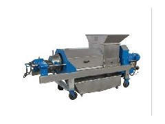 本機為螺旋式擠榨,工作過程是:先將物料經(jīng)破碎輥裝置進行初破碎后,由輸送螺旋將進入進料箱的物料推向擠榨螺旋,通過擠榨螺旋的螺距減小和軸徑增大,并在篩筒壁和錐形體阻力的作用下,使物料所含的液體物料(如果汁)被擠壓出。擠出的液體從篩孔(物料不同孔徑不同)中流出,集中在接汁斗內。