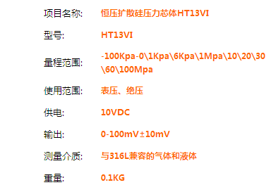 產(chǎn)品描述 :HTxxV系列隔離膜壓力芯體是一種采用恒壓供電的芯體。具有精度高、多種結(jié)構(gòu)、穩(wěn)定性好等特點(diǎn),可應(yīng)用在與316L不銹鋼相兼容的各種液體、氣體壓力的測(cè)量和控制。