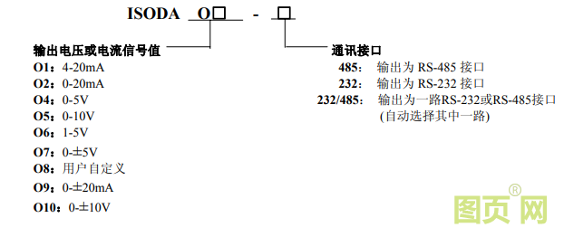 選型舉例 2: 型號(hào):ISODA O4-232 表示 0-5V 信號(hào)輸出,輸出為 RS-232 接口