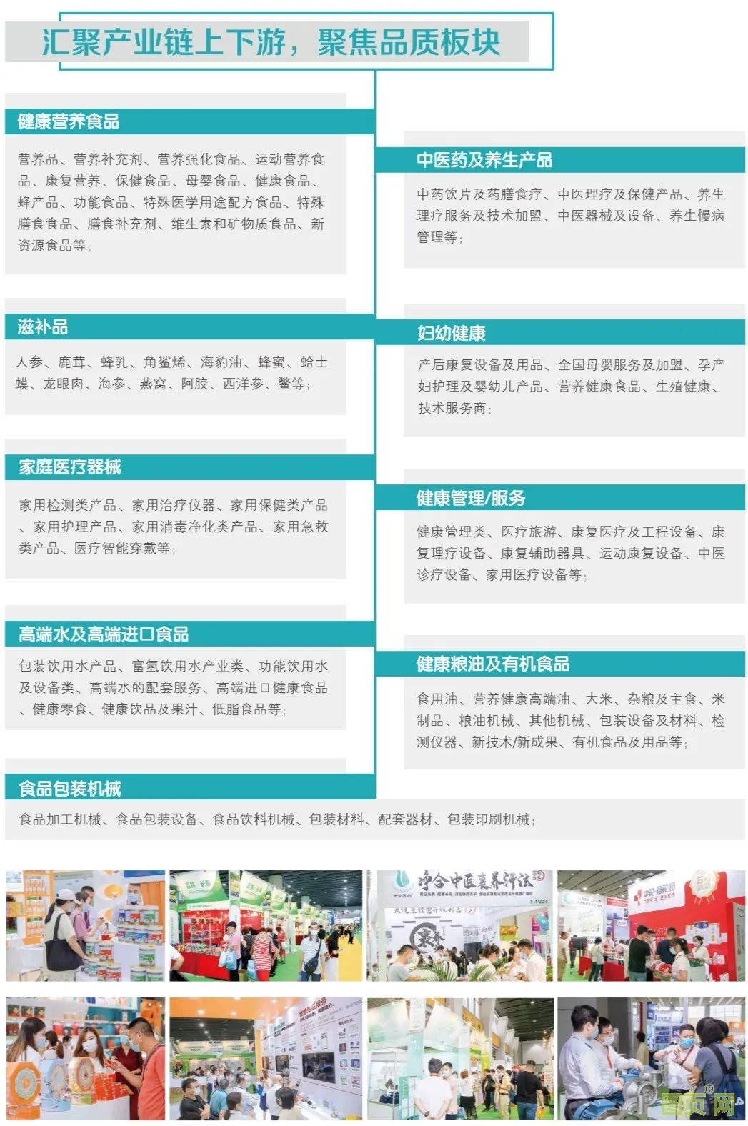 健康營養(yǎng)食品|特殊膳食食品|中醫(yī)藥及養(yǎng)生產(chǎn)品|滋補品|婦幼健康|家庭醫(yī)療器械|健康管理/服務(wù)|高端水及進口食品|健康糧油及有機食品|食品包裝機械