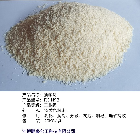本品以優(yōu)質(zhì)植物性油酸為原料經(jīng)連續(xù)皂化反應(yīng)生成外觀為淺黃色至黃色粉末,屬于陰離子表面活性劑,是由憎水基和親水基兩部分構(gòu)成的化合物。具有優(yōu)良的乳化力,滲透力和去污力,有良好水溶解性,水溶液呈堿性。被廣泛應(yīng)用于浮選礦捕收劑、橡膠隔離、制皂、潤滑劑、乳化劑、塑料穩(wěn)定劑、泡沫混凝土發(fā)泡和穩(wěn)泡、建筑防水方面新材料添加劑等多個領(lǐng)域。