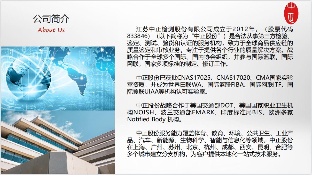 江蘇中正檢測(cè)股份有限公司(簡(jiǎn)稱中正檢測(cè)),是合法從事國(guó)際體育協(xié)會(huì)檢測(cè)認(rèn)證、體育場(chǎng)館測(cè)試、高危場(chǎng)館檢測(cè)的第三方服務(wù)機(jī)構(gòu),致力于全球商品供應(yīng)鏈的質(zhì)量鑒定和審核業(yè)務(wù),專注于提供各個(gè)行業(yè)的質(zhì)量解決方案。