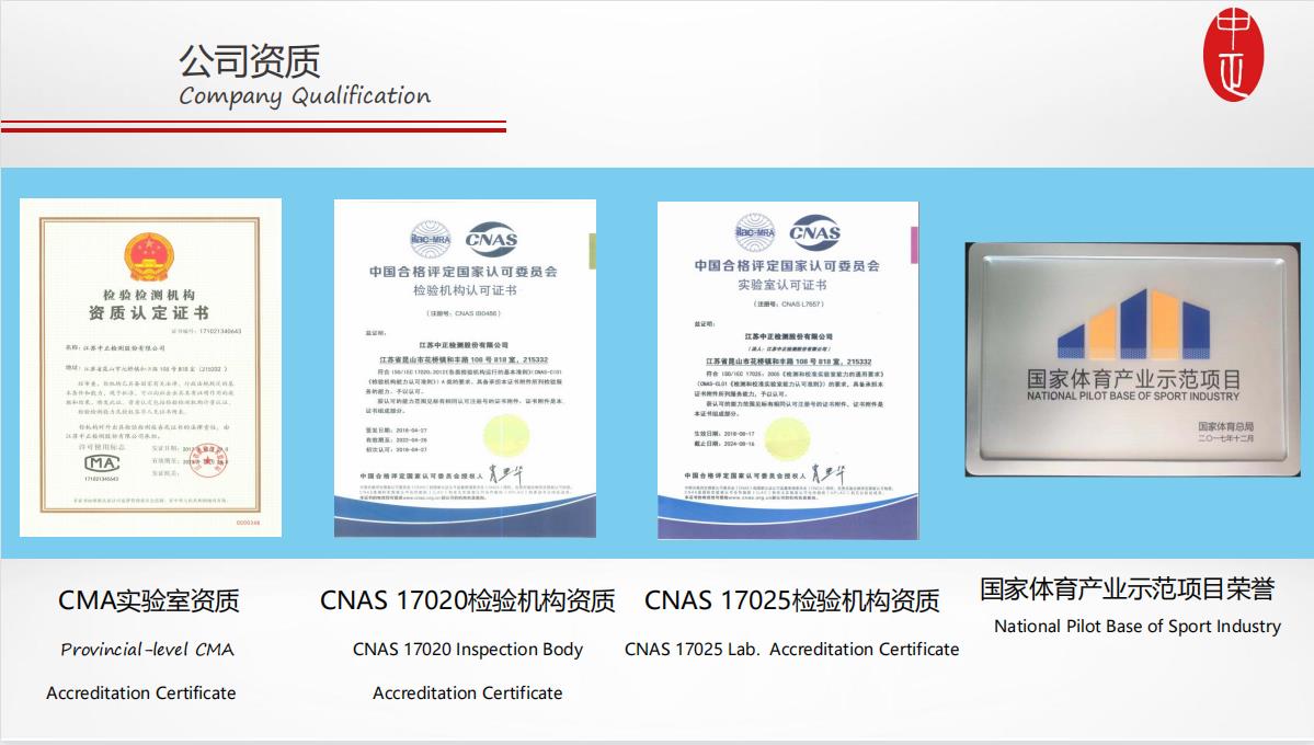 江蘇中正檢測(cè)股份有限公司作為國(guó)際田聯(lián)IAAF、國(guó)際籃聯(lián)FIBA、國(guó)際網(wǎng)聯(lián)ITF、國(guó)際登聯(lián)UIAA、國(guó)際羽聯(lián)BWF、國(guó)際足聯(lián)FIFA、國(guó)際手聯(lián)IHF等體育場(chǎng)館項(xiàng)目亞太區(qū)技術(shù)服務(wù)合作伙伴,江蘇中正檢測(cè)股份有限公司在中國(guó)區(qū)建立官方認(rèn)可實(shí)驗(yàn)室,為亞太地區(qū)提供公正、科學(xué)、安全、健康、環(huán)保的檢測(cè)認(rèn)證服務(wù)。