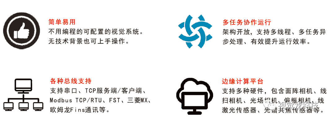 本方案采用的“龍睿AIoT”是一款低代碼、功能可視化、模塊化的視覺平臺,視覺工具拖拽式,無技術(shù)背景也可上手操作。 它包含幾千種算法,架構(gòu)開放、支持多線程多任務(wù)并行處理。龍睿擁有2D視覺、3D視覺、彩色視覺、AI深度學(xué)習(xí)視覺、視覺溯源、邊緣計(jì)算等技術(shù),可以連接各類相機(jī)和傳感器,實(shí)現(xiàn)智能制造、高端農(nóng)業(yè)、智能物流、智慧城市和智慧醫(yī)療等多領(lǐng)域應(yīng)用場景。