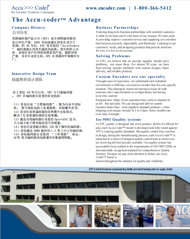 EPC (Encoder Products Company) 編碼器產(chǎn)品公司成立于1969年,是一家全球性的光電編碼器生產(chǎn)商,生產(chǎn)全套的編碼器為廣大工業(yè)用戶服務(wù)。EPC的編碼器產(chǎn)品被廣泛應(yīng)用于:伺服和步進電機的驅(qū)動控制,運動、位置和速度控制和反饋,電子計數(shù)器,自動化機器及工具,車床、磨床和CNC機器,裝配、包裝、切割及輸送設(shè)備,轉(zhuǎn)床和傳送帶,電梯控制和堆料機,數(shù)碼彩繪機和醫(yī)療儀器等等。EPC在英國亦有分廠,負責(zé)歐洲的生產(chǎn)、銷售。