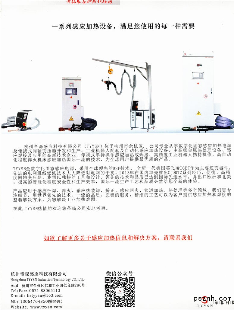 | 經(jīng)營(yíng)范圍: | 生產(chǎn):感應(yīng)加熱電源設(shè)備、感應(yīng)加熱設(shè)備、同軸變壓器、工業(yè)機(jī)器人、淬火機(jī)床、感應(yīng)加熱制冷設(shè)備、機(jī)電設(shè)備、電磁加熱器、電子產(chǎn)品;銷售:自產(chǎn)產(chǎn)品及其配件;中高頻感應(yīng)加熱電源,變壓器,感應(yīng)器及配件的研發(fā);貨物及技術(shù)進(jìn)出口(法律、行政法規(guī)禁止經(jīng)營(yíng)的項(xiàng)目除外,法律、行政法規(guī)限制經(jīng)營(yíng)的項(xiàng)目取得許可證后方可經(jīng)營(yíng)); | ||