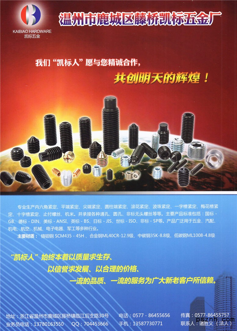 溫州市鹿城區(qū)藤橋凱標(biāo)五金加工廠 一字槽 十字槽 12.9級螺釘 8.8級螺絲點(diǎn)擊:1267 查看原圖![]() ![]() ![]() 電話: 0086-577-86455656