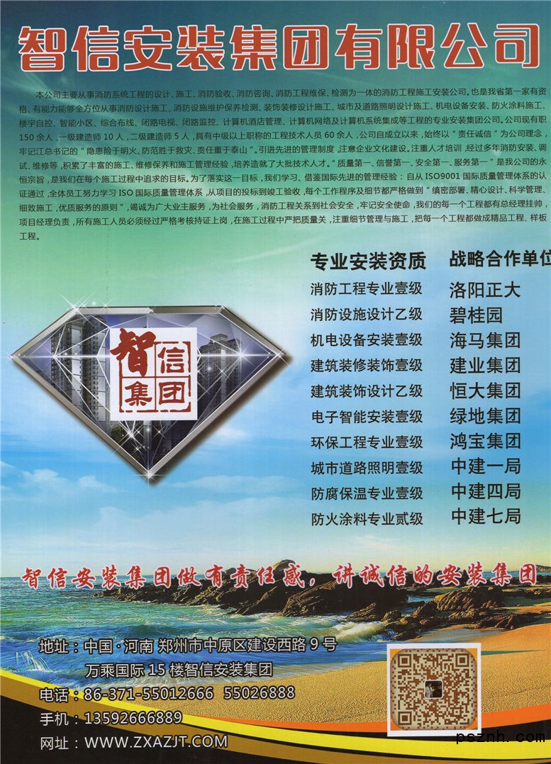 智信安裝集團(tuán)有限公司 消防專業(yè)施工壹級_城市道路照明壹級_機(jī)電設(shè)備安裝壹級點擊:934 查看原圖![]() ![]() ![]() 地址:中國·河南 鄭州市中原區(qū)建設(shè)西路9號萬乘國際廣場15層智信安裝集團(tuán)