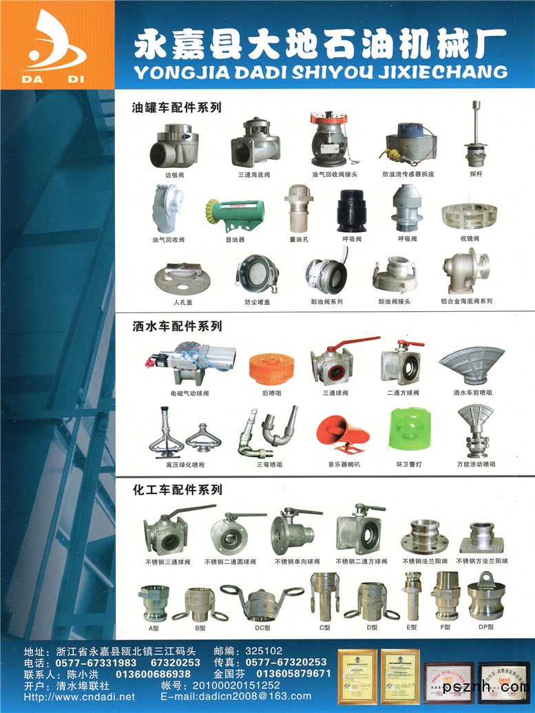 永嘉縣大地石油機(jī)械廠 油罐車配件 灑水車配件 海底閥 人孔蓋點擊:677 查看原圖![]() ![]() ![]() 公司名稱: 永嘉縣大地石油機(jī)械廠