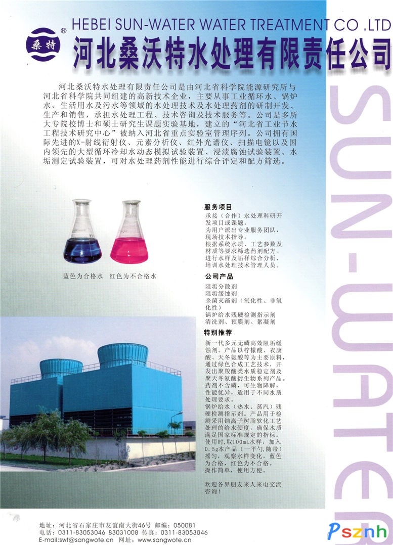河北桑沃特水處理有限責(zé)任公司_工業(yè)循環(huán)水_鍋爐水_生活用水_污水處理藥劑點(diǎn)擊:1146 查看原圖![]() ![]() ![]() 公司電話: 3031008 公司地址: 中國(guó)·河北·石家莊·石家莊市·