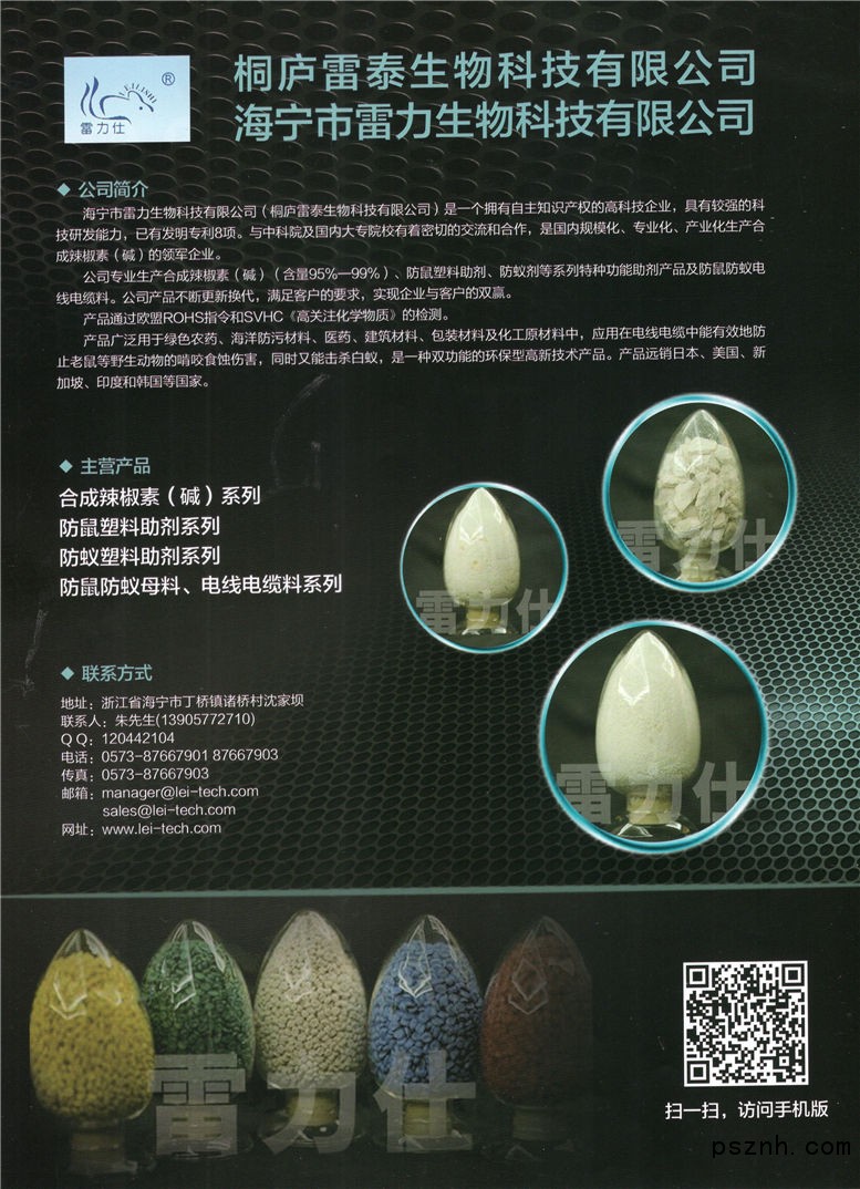 | 經(jīng)營(yíng)范圍: | 生物防污產(chǎn)品技術(shù)開發(fā);辣椒素(堿)、防鼠防蟻塑料助劑制造、加工。 | ||