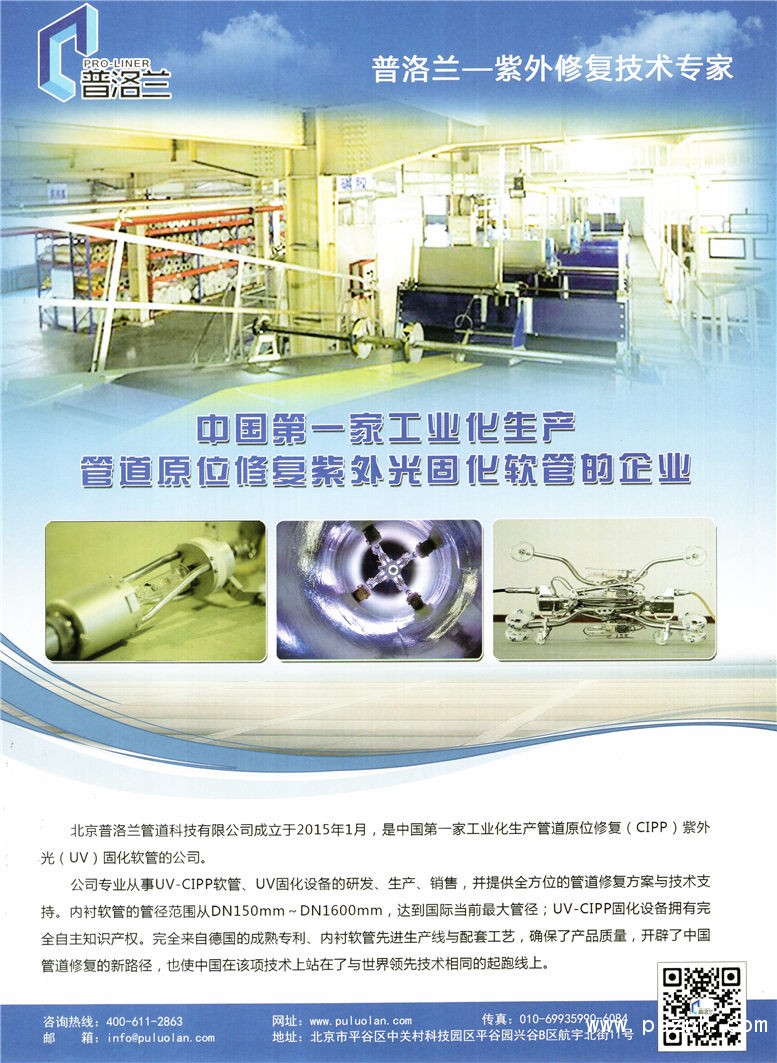 北京普洛蘭管道科技有限公司 CIPP軟管_UV-CIPP軟管固化機(jī)點擊:613 查看原圖![]() ![]() ![]() 北京普洛蘭管道科技有限公司
