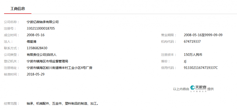 | 經(jīng)營范圍: | 軸承、機械配件、五金件、塑料制品的制造、加工。 | ||