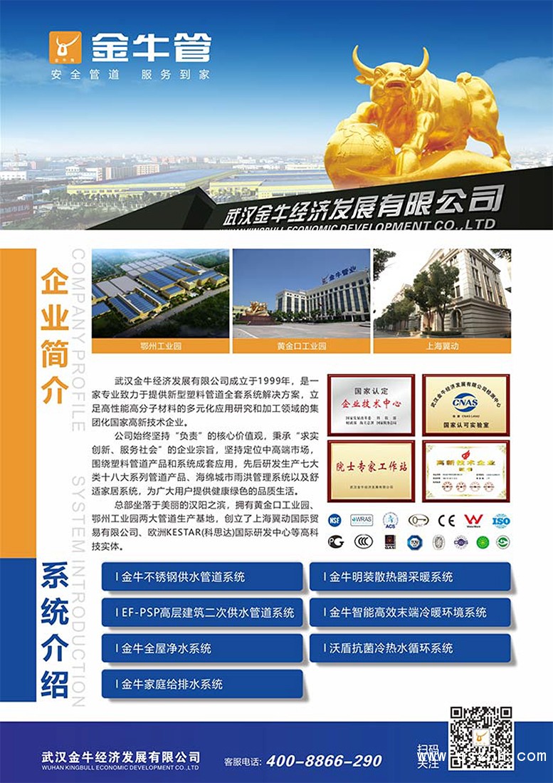 | 公司簡介: | 武漢金牛經(jīng)濟(jì)發(fā)展有限公司成立于1999年,是一家專業(yè)致力于提供新型塑料管道全套系統(tǒng)解決方案,立足高性能高分子材料的多元化應(yīng)用研究和加工領(lǐng)域的集團(tuán)化國家高新技術(shù)企業(yè)。