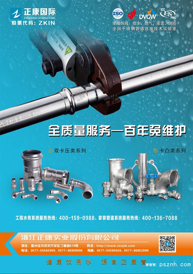 ![]() 正康實(shí)業(yè)股份經(jīng)過(guò)十多年的發(fā)展,已發(fā)展為國(guó)家高新技術(shù)企業(yè),省級(jí)管道技術(shù)研發(fā)中心;國(guó)家和行業(yè)標(biāo)準(zhǔn)制定主編和參編單位之一;全國(guó)不銹鋼管道連接技術(shù)實(shí)驗(yàn)室;獲國(guó)家創(chuàng)新基金;獲得德國(guó)DVGW認(rèn)證(國(guó)際權(quán)威認(rèn)證);專利示范企業(yè),有發(fā)明和實(shí)用新型專利30多項(xiàng)。成為行業(yè)細(xì)分市場(chǎng)第一家IPO上市企業(yè)。 公司產(chǎn)品和解決方案已經(jīng)應(yīng)用于星級(jí)酒店、醫(yī)院、學(xué)校、機(jī)場(chǎng)、體育館、高端地產(chǎn)、政府大樓等5000多個(gè)工程項(xiàng)目。完成了近100多個(gè)小區(qū)管網(wǎng)改造和智能化城市供水管網(wǎng)工程項(xiàng)目。