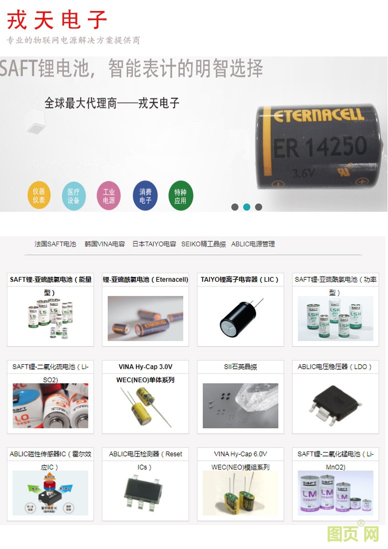戎天電子(上海)有限公司-SAFT一次性鋰電池和可充電電池系列;VINA和TAIYO超級電容系列;鋰離子超級電容系列;ABLIC電源管理芯片和鋰電保護(hù)芯片;可充電電池組(可按照客戶要求定制)。點(diǎn)擊:834 查看原圖![]() ![]() ![]() 簡介: