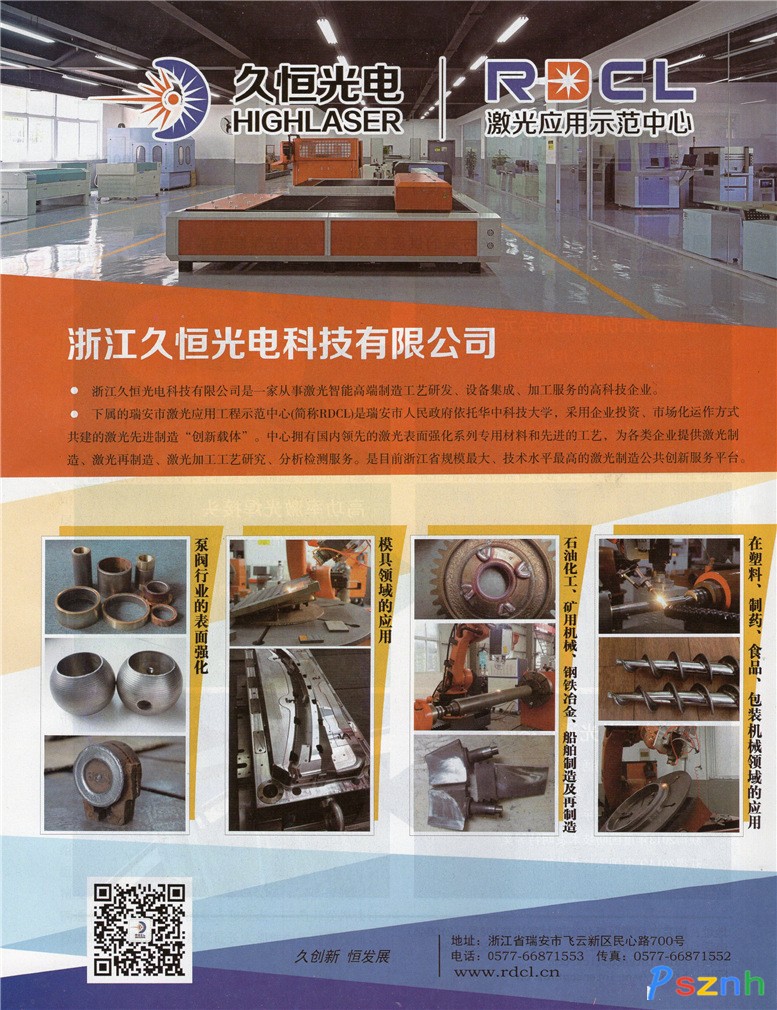浙江久恒光電科技有限公司 激光熔覆(堆焊)點擊:674 查看原圖![]() ![]() ![]() 瑞安市激光應(yīng)用工程示范中心有限公司