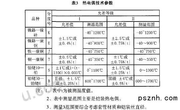 以上詳細(xì)介紹了工業(yè)測量中常用幾種熱電偶的性能,實(shí)際使用中用戶還有其它不同分度號的熱電偶可選擇,如表3所示,統(tǒng)計(jì)了熱電偶的相關(guān)技術(shù)參數(shù),供大家選型時參考。