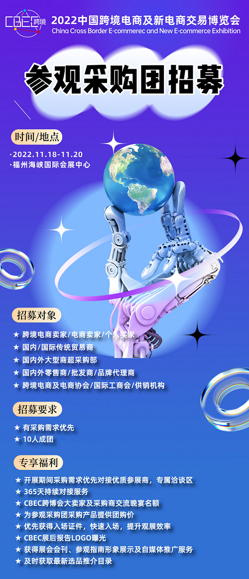 CBEC跨博會(huì)將于2022年11月18-20日在福州海峽國(guó)際會(huì)展中心舉行。本屆展會(huì)以“跨境電商迎來(lái)利好,中國(guó)制造惠及世界”為主題,“踐行新發(fā)展理念,譜寫合作新篇章”為指導(dǎo)思想。展會(huì)面積達(dá)45000平方米,將有1500+企業(yè)、800+供應(yīng)商、500+SKU、30000+專業(yè)觀眾到場(chǎng),更有100+億級(jí)采購(gòu)需求現(xiàn)場(chǎng)發(fā)布。