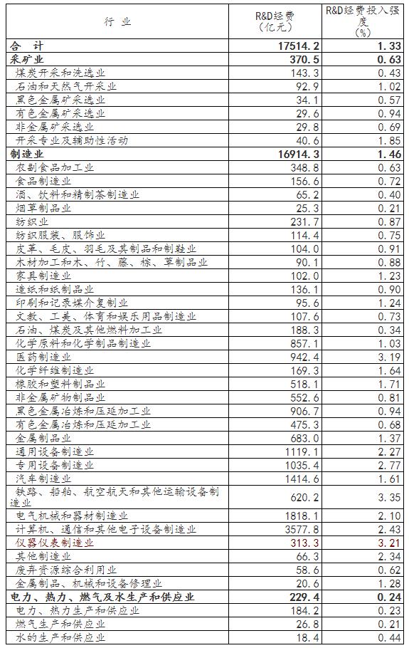 2021年,我國(guó)研究與試驗(yàn)發(fā)展(R&D)經(jīng)費(fèi)投入繼續(xù)保持較快增長(zhǎng),國(guó)家財(cái)政科技支出穩(wěn)步增加,研究與試驗(yàn)發(fā)展(R&D)投入強(qiáng)度持續(xù)提升,基礎(chǔ)研究占比明顯提高。制造業(yè)R&D經(jīng)費(fèi)16914.3億元,投入強(qiáng)度為1.46%,其中儀器儀表制造業(yè)R&D經(jīng)費(fèi)313.3億元,投入強(qiáng)度為3.21%。