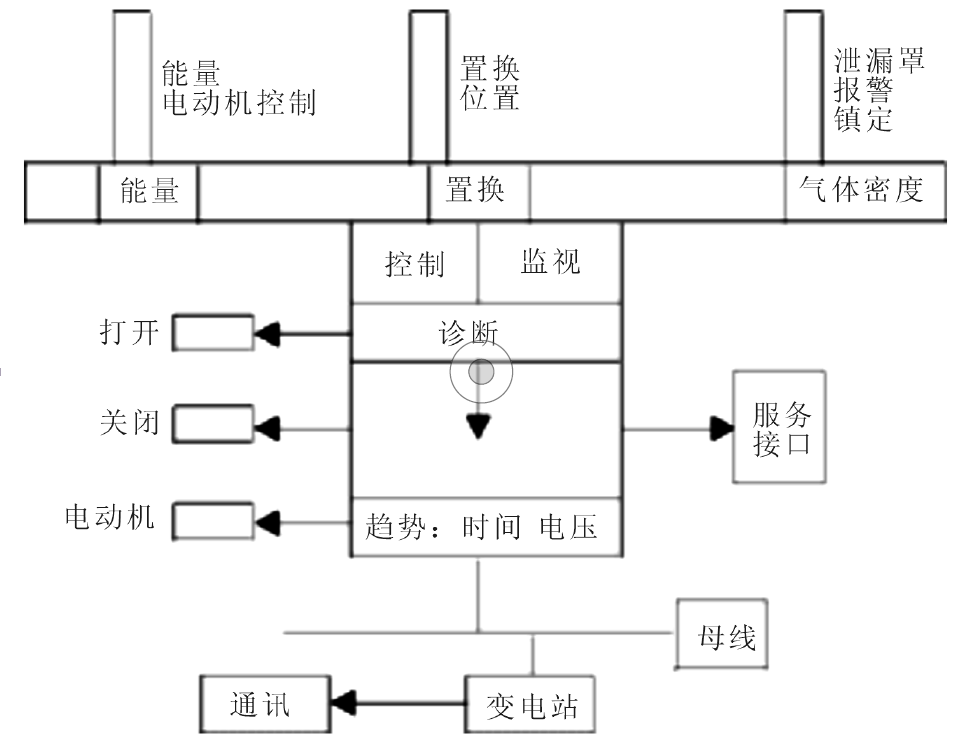 圖1概要說明了一種兼有計算機系統(tǒng)和傳感裝置的智能化斷路器工作原理。主要的傳感器可探明氣體密度,通過監(jiān)控其運動和能量變化,反映操作機構(gòu)狀態(tài)。氣體密度傳感器發(fā)出的信號能夠?qū)崿F(xiàn)連續(xù)的狀態(tài)監(jiān)測,確定趨勢走向以及檢測極限值,并能在此基礎(chǔ)上實現(xiàn)常規(guī)的SF6氣體的鎖定和報警功能。同樣,在運動傳感器和能量傳感器的幫助下,操作機構(gòu)的狀態(tài)可實現(xiàn)監(jiān)控。另外,這些傳感器的信號可同時用于常規(guī)的位置指示和電動機控制功能上。