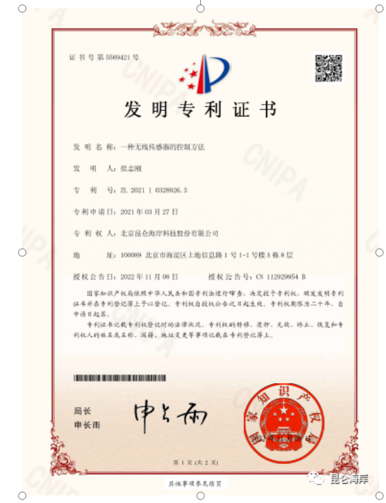 日前,由我司(昆侖海岸)申請的”一種無線傳感器的控制方法”發(fā)明專利正式獲得國家知識產(chǎn)權(quán)局授權(quán),這標志著昆侖海岸在技術(shù)創(chuàng)新和知識產(chǎn)權(quán)方面又邁出了重要的一步。