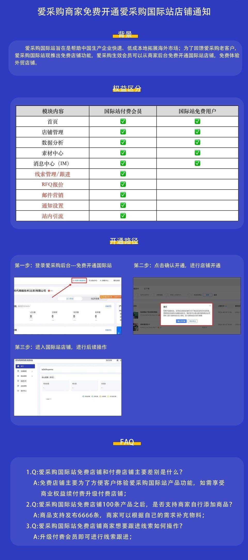 1. 免費(fèi)開通:只限已開通愛采購店鋪會員的企業(yè),沒有開通國內(nèi)愛采購的企業(yè)需要開通國內(nèi)愛采購,開戶是6980元/年。免費(fèi)開通的權(quán)益包括發(fā)布產(chǎn)品信息、展示企業(yè)信息、與海外買家進(jìn)行溝通等基本功能,使企業(yè)可以獲得基本的曝光和推廣。