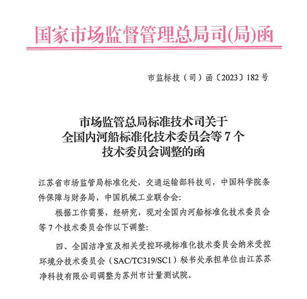近日,國家市場監(jiān)督管理總局標(biāo)準(zhǔn)技術(shù)司正式發(fā)文,全國潔凈室及相關(guān)受控環(huán)境標(biāo)準(zhǔn)化技術(shù)委員會(huì)納米受控環(huán)境分技術(shù)委員會(huì)(SAC/TC319/SC1)秘書處承擔(dān)單位正式調(diào)整為我院,這是我院承擔(dān)的第三個(gè)標(biāo)準(zhǔn)化秘書處。在此之前,我院已是全國納米技術(shù)標(biāo)準(zhǔn)化技術(shù)委員會(huì)蘇州工作組(SAC/TC229/WG11)和江蘇省納米技術(shù)標(biāo)準(zhǔn)化技術(shù)委員會(huì)(JS/TC53)秘書處單位。