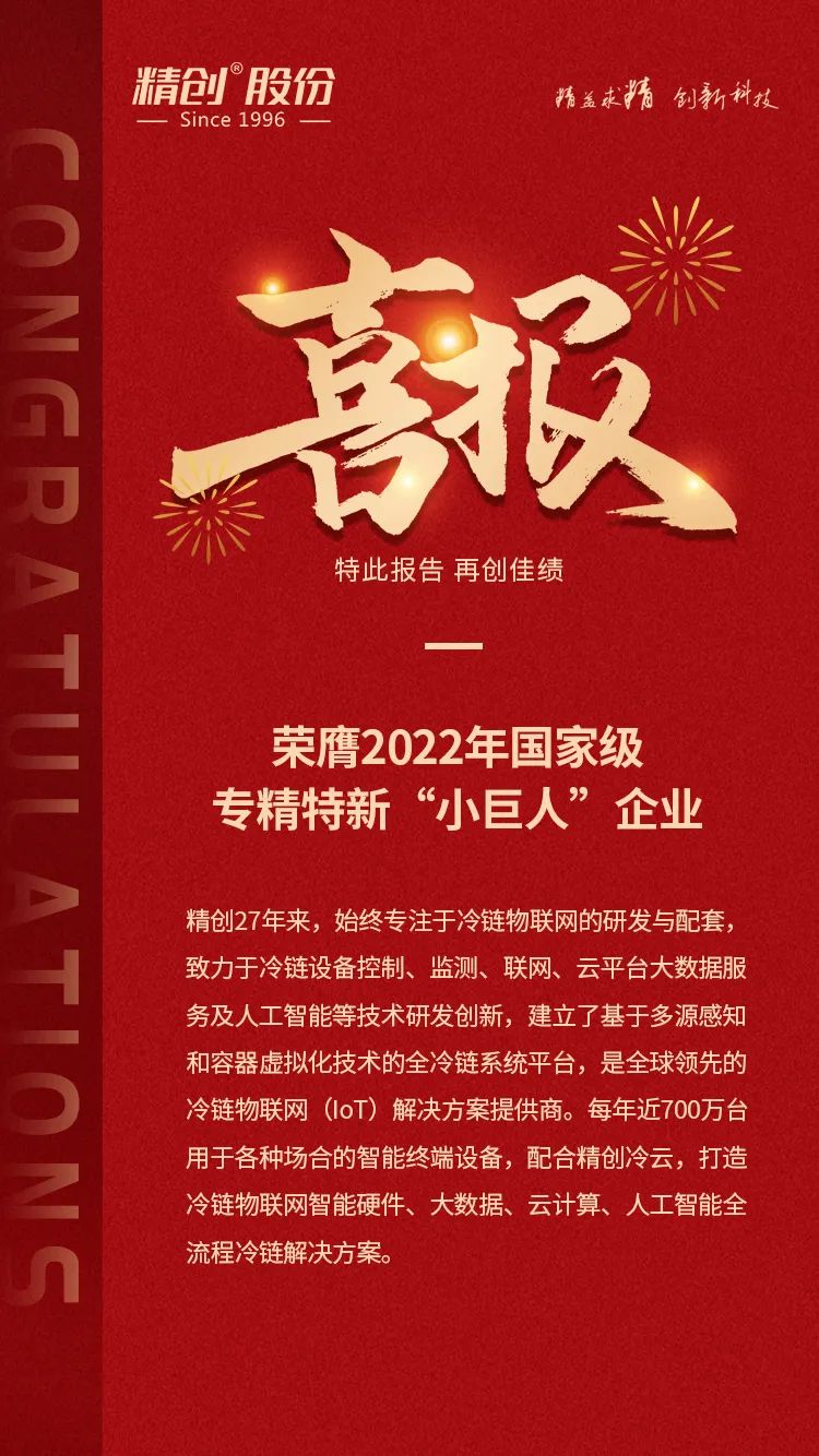 “專精特新”企業(yè)在國內(nèi)外都是非常重要的認可,此次被認定為國家級專精特新“小巨人”企業(yè),是對精創(chuàng)過去在冷鏈物聯(lián)網(wǎng)領(lǐng)域?qū)I(yè)化、精細化、特色化、新穎化等方面所作努力的肯定,也是對精創(chuàng)核心技術(shù)、創(chuàng)新能力、管理體系、市場競爭力等綜合實力的高度認可。