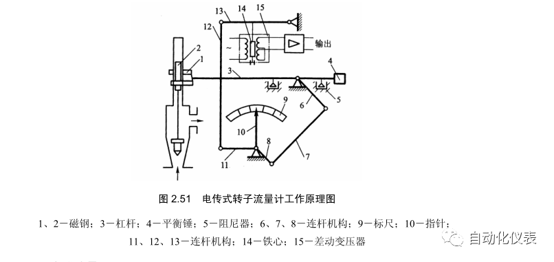 上面所介紹的轉子流量計只適用于就地指示,對配有電遠傳裝置的轉子流量計,可以將反映流量大小的轉子高度 h 轉換為電信號,傳送到其他儀表進行指示、記錄和控制。圖2.51 為電傳式轉子流量計的工作原理圖。當流體流量變化時使轉子轉動,磁鋼 1 和 2 通過帶動杠桿 3 及連桿機構 6 、 7 、 8 使指針 10 在標尺 9 上就地指示流量。與此同時,差動變壓器檢測出轉子的位移,產生差動電勢通過放大和轉換后輸出電信號,通過顯示儀表顯示和通過控制儀表進行調節(jié)。