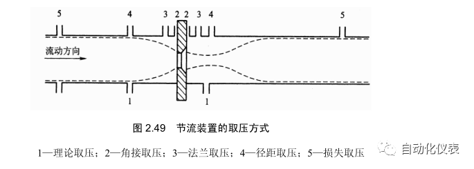 差壓式流量計是通過測量節(jié)流元件前后靜壓力差△ p 來實現(xiàn)流量測量的值與取壓孔位置和取壓方式緊密相關。根據(jù)節(jié)流裝置取壓口位置,取壓方式分為理論取壓、角接取壓、法蘭取壓、徑距取壓與損失取壓五種,如圖 2.49 所示。國家規(guī)定標準的取壓方式有角接取壓、法蘭取壓和 D-D/2 取壓。