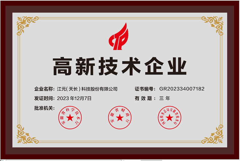 江元(天長(zhǎng))公司喜獲國(guó)家級(jí)高新技術(shù)企業(yè)認(rèn)證