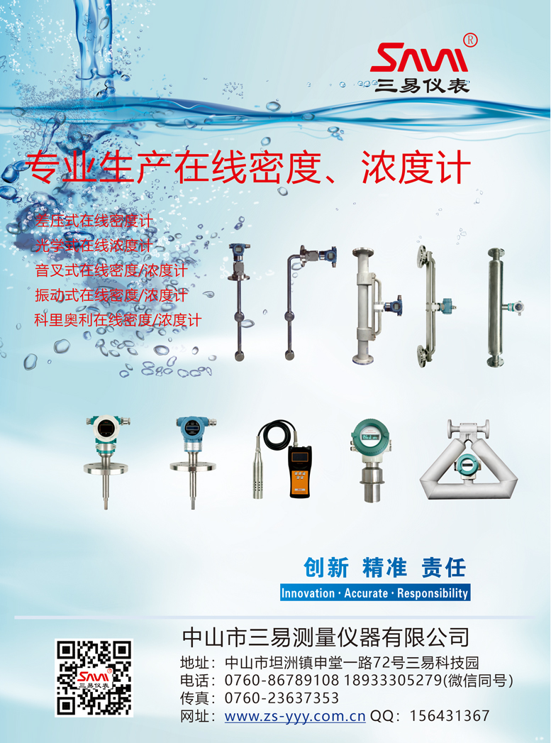中山市三易測量儀器有限公司成立于2009年,位于中山市坦洲鎮(zhèn),是一家專業(yè)從事工業(yè)自動化測控儀器的研發(fā)、生產(chǎn)、銷售和服務(wù)的企業(yè)。公司引進了國內(nèi)外成熟的儀表技術(shù),專注于在線密度計、濃度計、壓力變送器、流量計、液位計、溫度等過程控制儀表的研發(fā)與制造,并在在線濃密度檢測領(lǐng)域積累了豐富的經(jīng)驗和應(yīng)用實踐,與多所高等院校、研究所建立了緊密合作關(guān)系。公司擁有雄厚的技術(shù)力量、先進的生產(chǎn)工藝、齊全的檢測設(shè)備和完善的管理程序,通過中國質(zhì)量認證中心的ISO9001:2000質(zhì)量體系認證和中國船舶重工集團公司第七零四研究所的環(huán)境工程與可靠性試驗認證,保證產(chǎn)品的安全性、可靠性和穩(wěn)定性。
