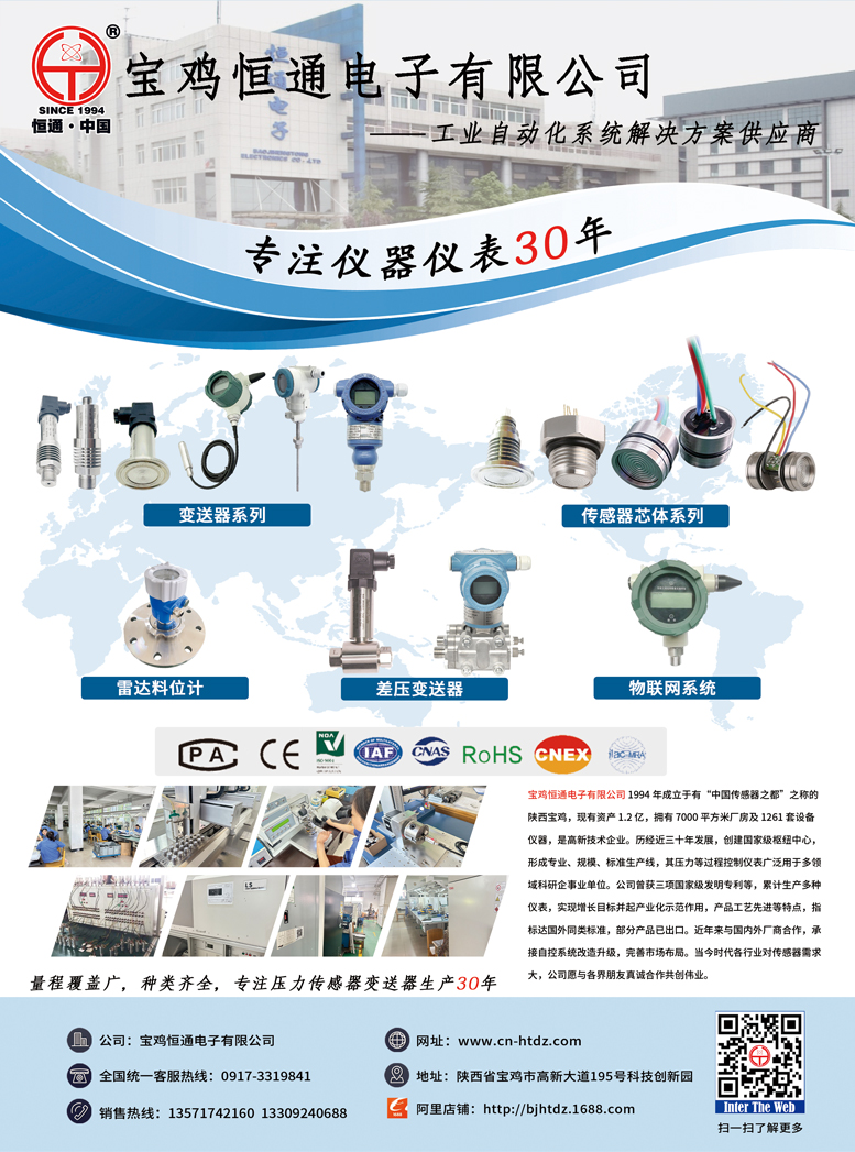 寶雞恒通電子有限公司位于“中國(guó)傳感器之都”陜西省寶雞市,成立于1994年,現(xiàn)有資產(chǎn)1.2億,擁有廠房7000平方米,設(shè)備儀器1261套,是集科研、生產(chǎn)與銷售服務(wù)為一體的高新技術(shù)企業(yè)。經(jīng)過(guò)近三十年的創(chuàng)新發(fā)展,恒通電子創(chuàng)建了國(guó)家級(jí)壓力傳感器產(chǎn)業(yè)化樞紐中心,形成了專業(yè)化、規(guī)?;?、標(biāo)準(zhǔn)化的生產(chǎn)線。公司生產(chǎn)的壓力、溫度、液位、流量等過(guò)程控制儀器儀表,廣泛應(yīng)用于航空航天、水運(yùn)航海、石油化工、水利水文、電力、煤炭冶金、供水、供氣、供熱、醫(yī)學(xué)生物工程等領(lǐng)域的計(jì)量、控制、監(jiān)測(cè)系統(tǒng)中。